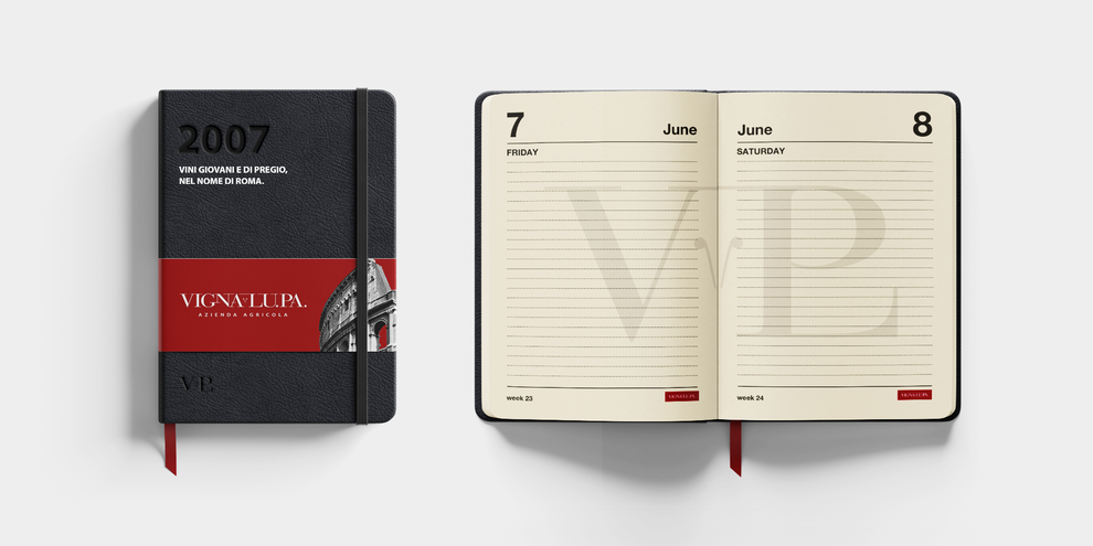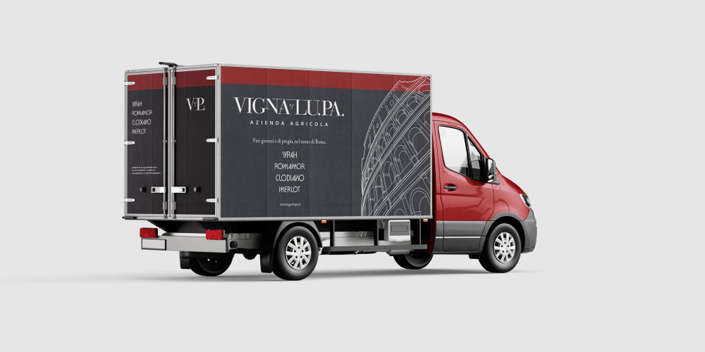 Il lettering è stato sottoposto ad un’operazione di compressione in verticale al fine di ottenere una sensazione di adagiatezza sulla retta di allineamento. L’elemento che divide la parola VIGNA dalla parola LU.PA., rappresenta da un lato i peduncoli (richiamo alla morfologia della vite necessari per rifornire gli acini, ovvero l’uva, dell’acqua e delle altre componenti), dall’altro il simbolo distintivo del sacerdote etrusco: il lituo (richiamo alla civiltà etrusca).